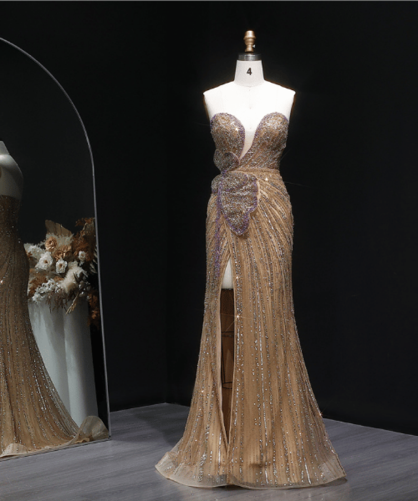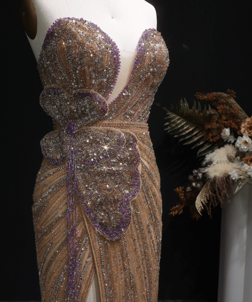يتميز الفستان بصدر على شكل قلب (Sweetheart) يمنح لمسة رومانسية حالمة، مع تفاصيل مطرزة بالكريستال والخرز اللامع تضيف بريقًا راقيًا يلفت الأنظار دون مبالغة.