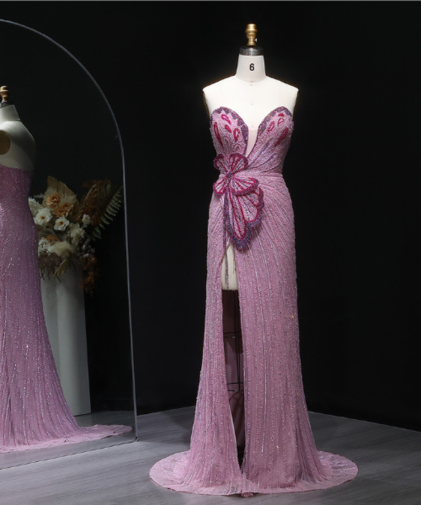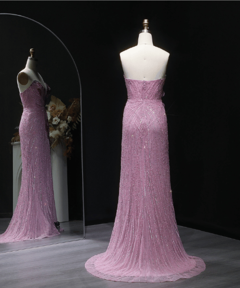 ارتدي سحر الأنوثة مع فستان بلونه الوردي الأنيق وتصميمه الفاخر المستوحى من السحر العربي، ويجمع الفستان بين قصّة حورية البحر المبهرة وخامة التول المنسوج الفاخر التي تنسدل بانسيابية لتُبرز القوام برقة وأناقة.
