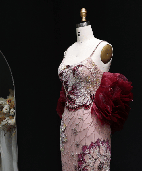 الزينة مصممة بعناية من تطريز الأزهار الوردية والكرانيش الرقيقة لتضفي لمسة فنية ساحرة، تجعل الفستان قطعة فريدة لكل مناسبة راقية. إنه خيار مثالي لكل من تبحث عن فستان سهرة فاخر للمناسبات وحفلات الزفاف يجمع بين الفخامة والتميز.